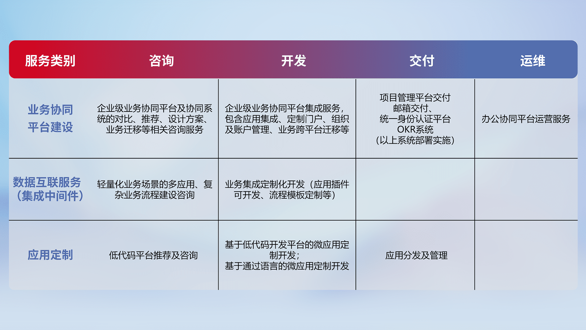 针对钉钉、、企微、、、IDaas等平台级产品提供产品的规划、、、方案、、、交付、、定制化开发等服务,,,实现如统一协同办公、、、、智能客户服务、、、、混合会议管理、、智能数据查询、、等业务场景,,实现数字化转型。。。。