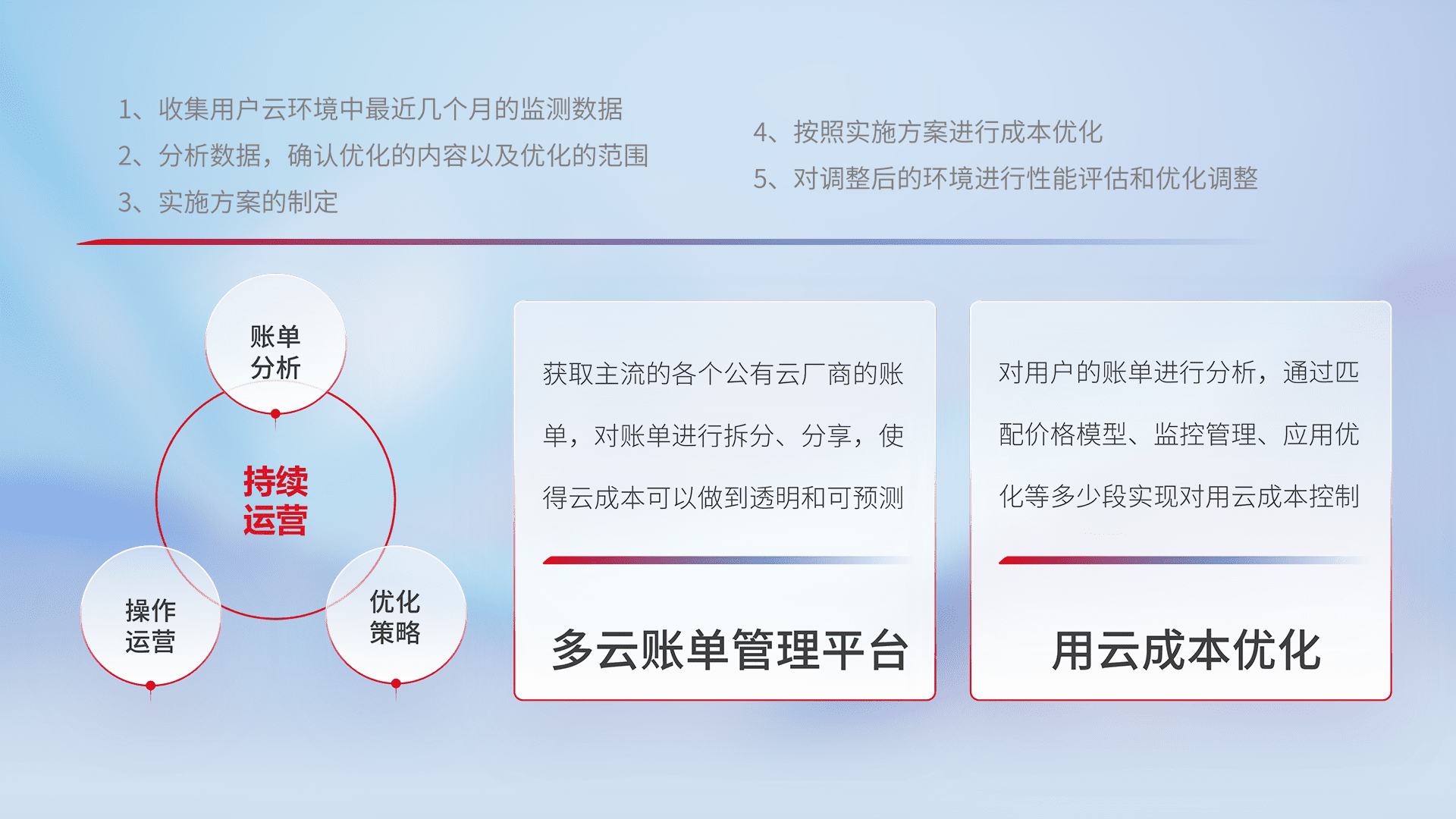 通过多云纳管,,以统一的资源数据模型把客户的云资源进行抽象和封装,,,,进而实现对多云资源的统一操作,,,,保障云资源管理的可靠性、、、稳定性与可用性。。量身定制化运维内容,,配置、、、、开发运维、、、补丁管理、、、备份、、、、监控、、认证和访问管理、、审计和日常巡检等,,,,保障在用云过程中的可靠度,,,稳定度以及高可用率。。。